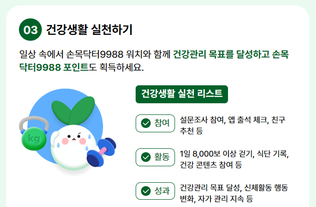 그 다음 설문조사, 출석체크, 친구 추천 등에 참여하고 1일8천보 이상 걷기, 식단기록, 목표 달성 등 건강생활을 실천합니다.